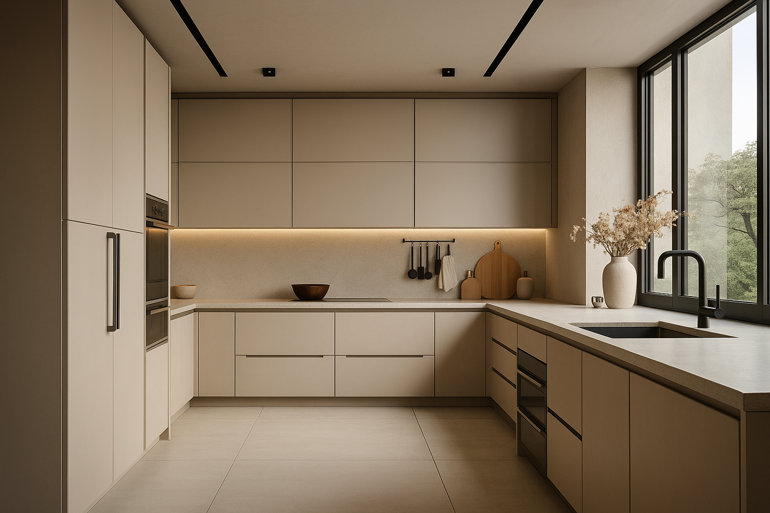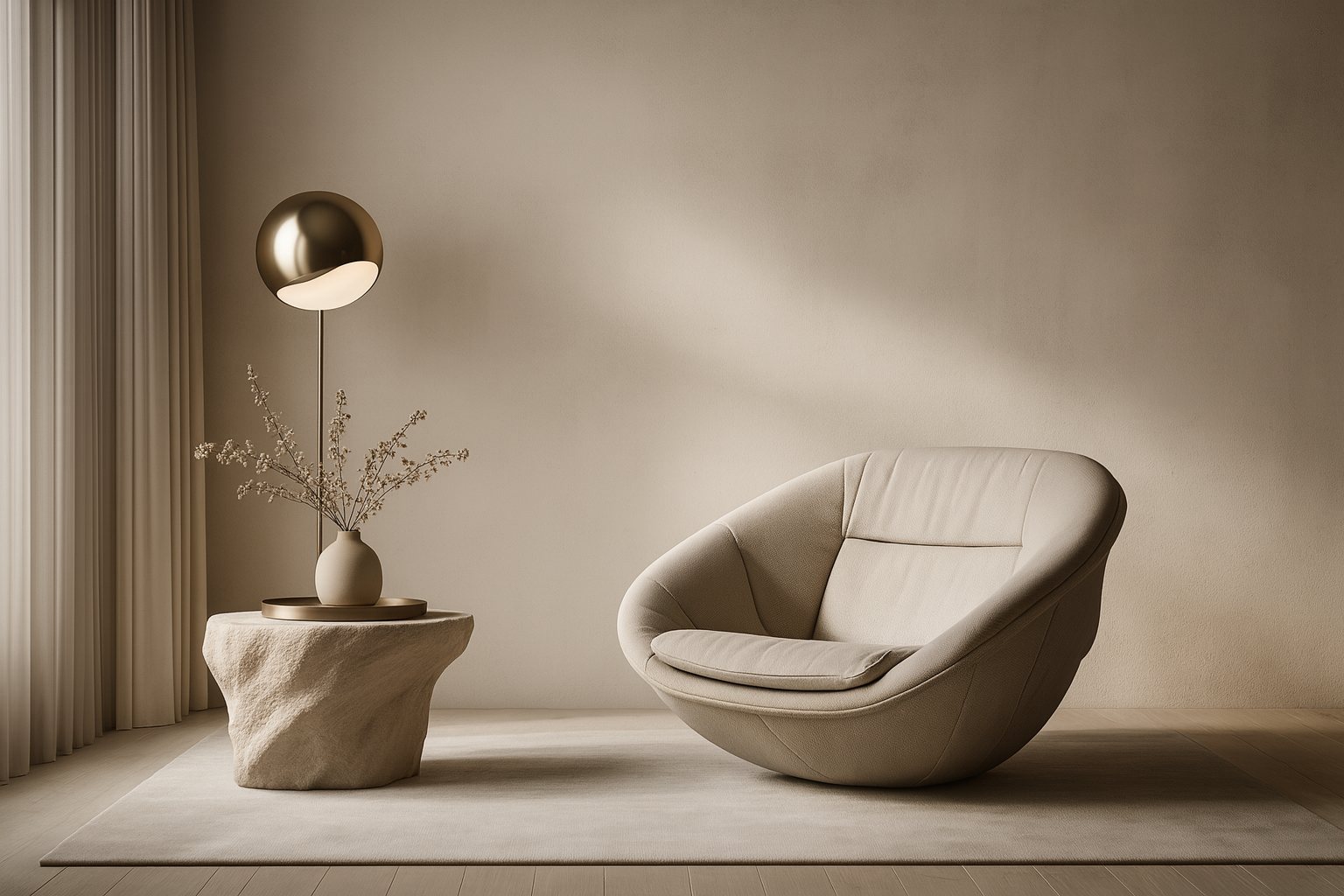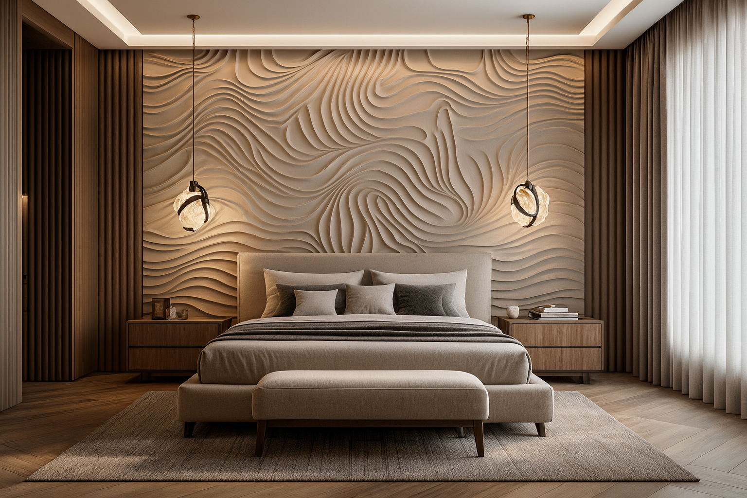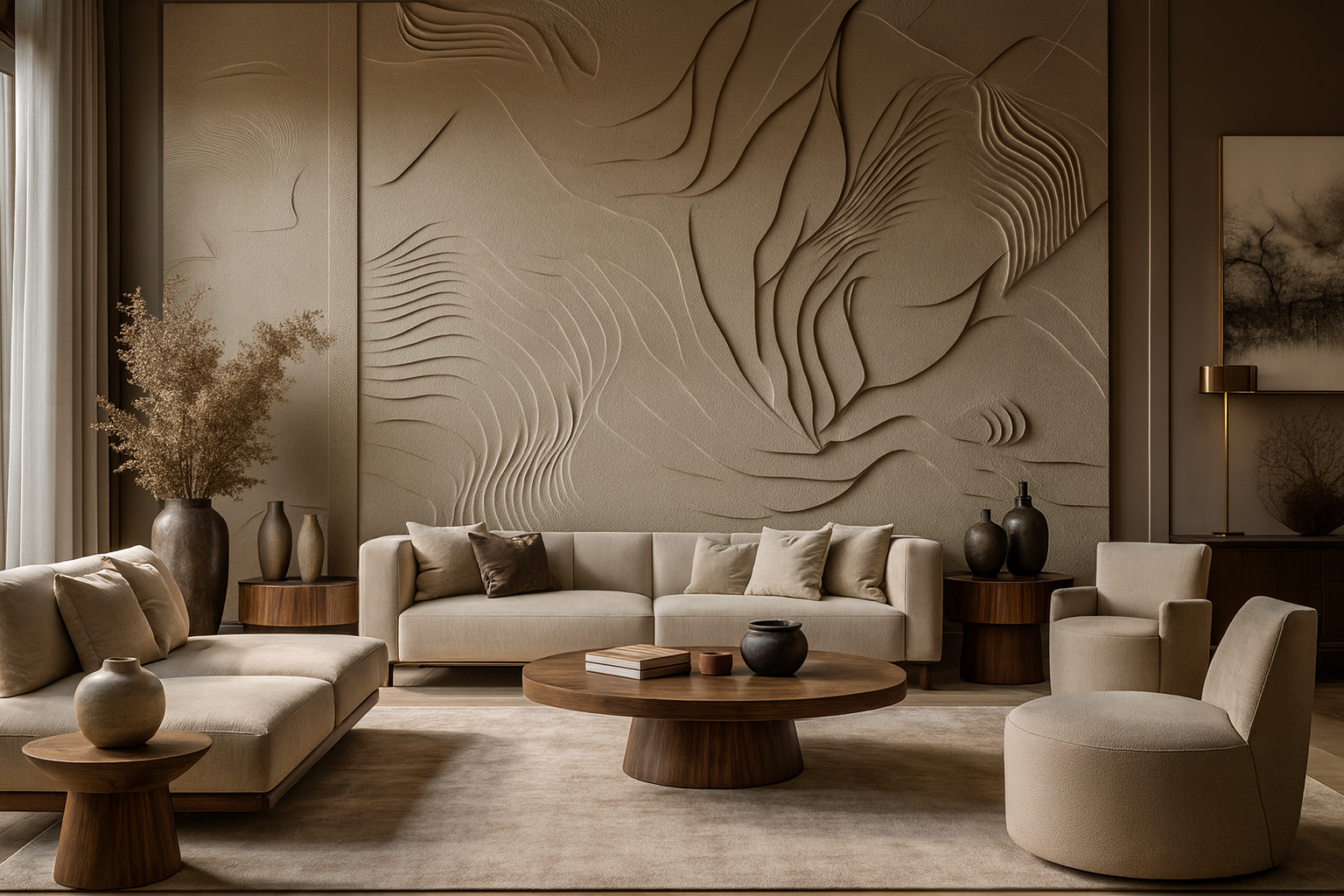 A residence shaped by soft textures and sculptural detailing. Muted tones and layered finishes flow across spaces to create harmony and depth. Calm, cohesive, and timeless, it embodies quiet luxury in every corner.