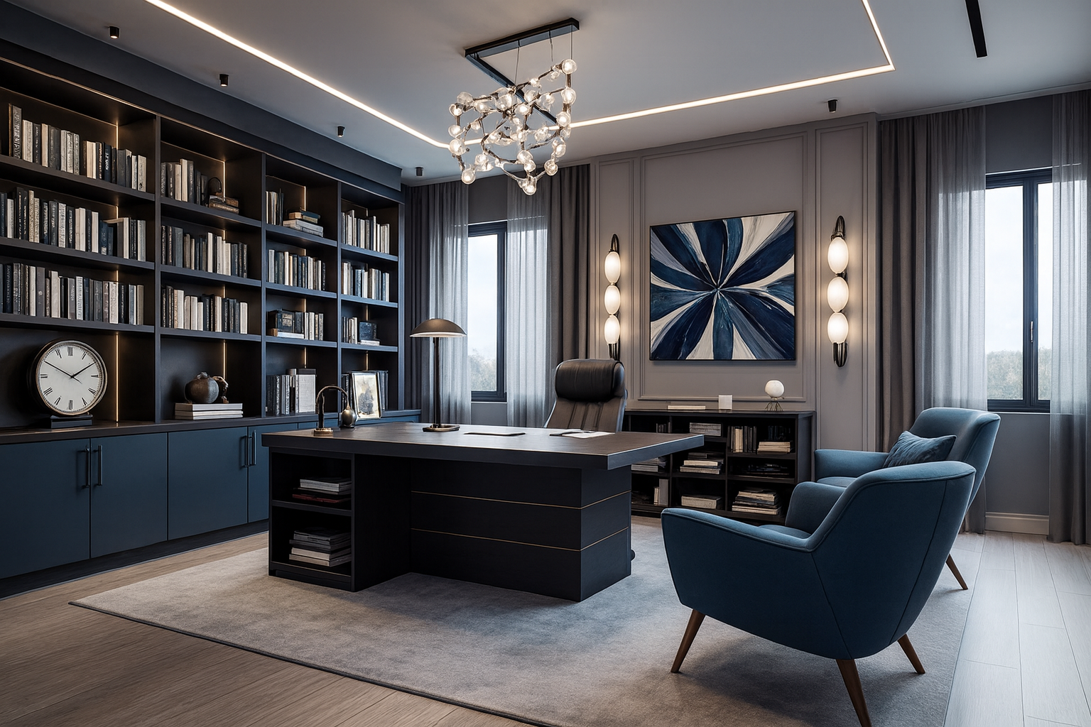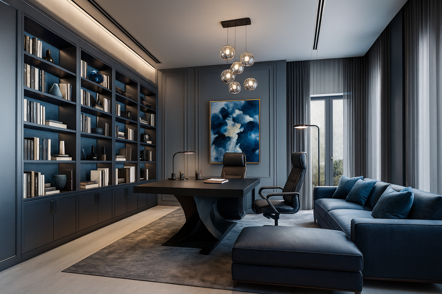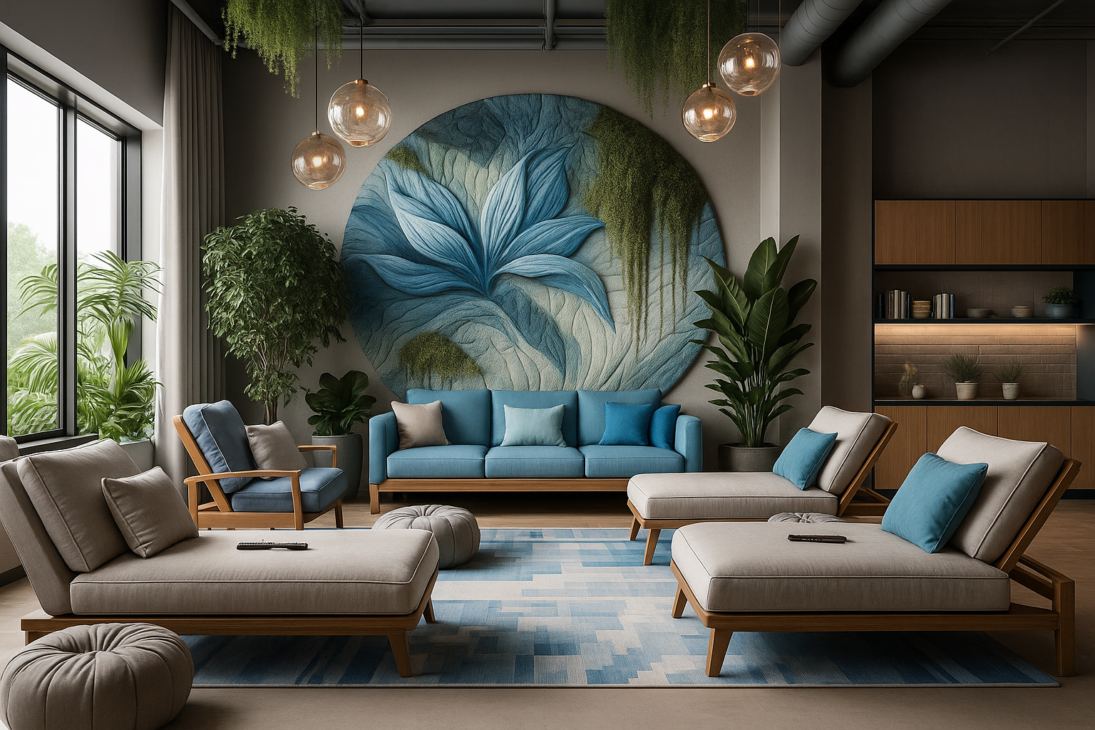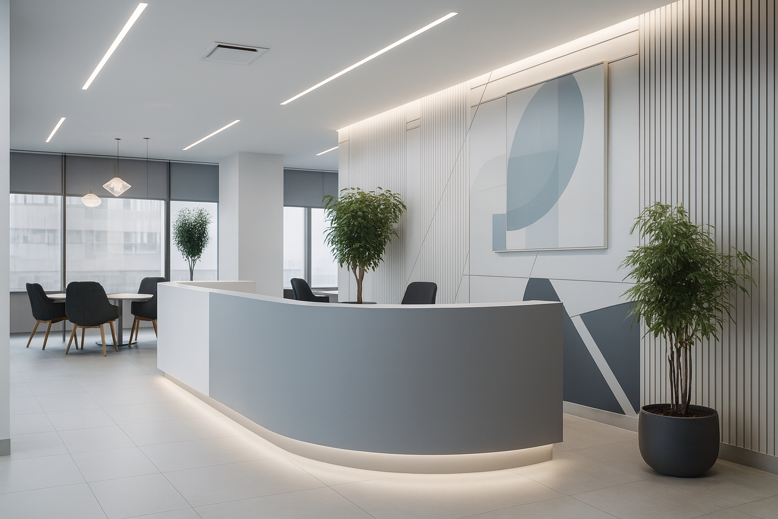 An office inspired by the theme ‘Ocean Meets Sky’. Fluid partitions and clean geometry articulate zones for clarity and flow. A restrained palette with expansive light fosters balance, productivity, and ease.