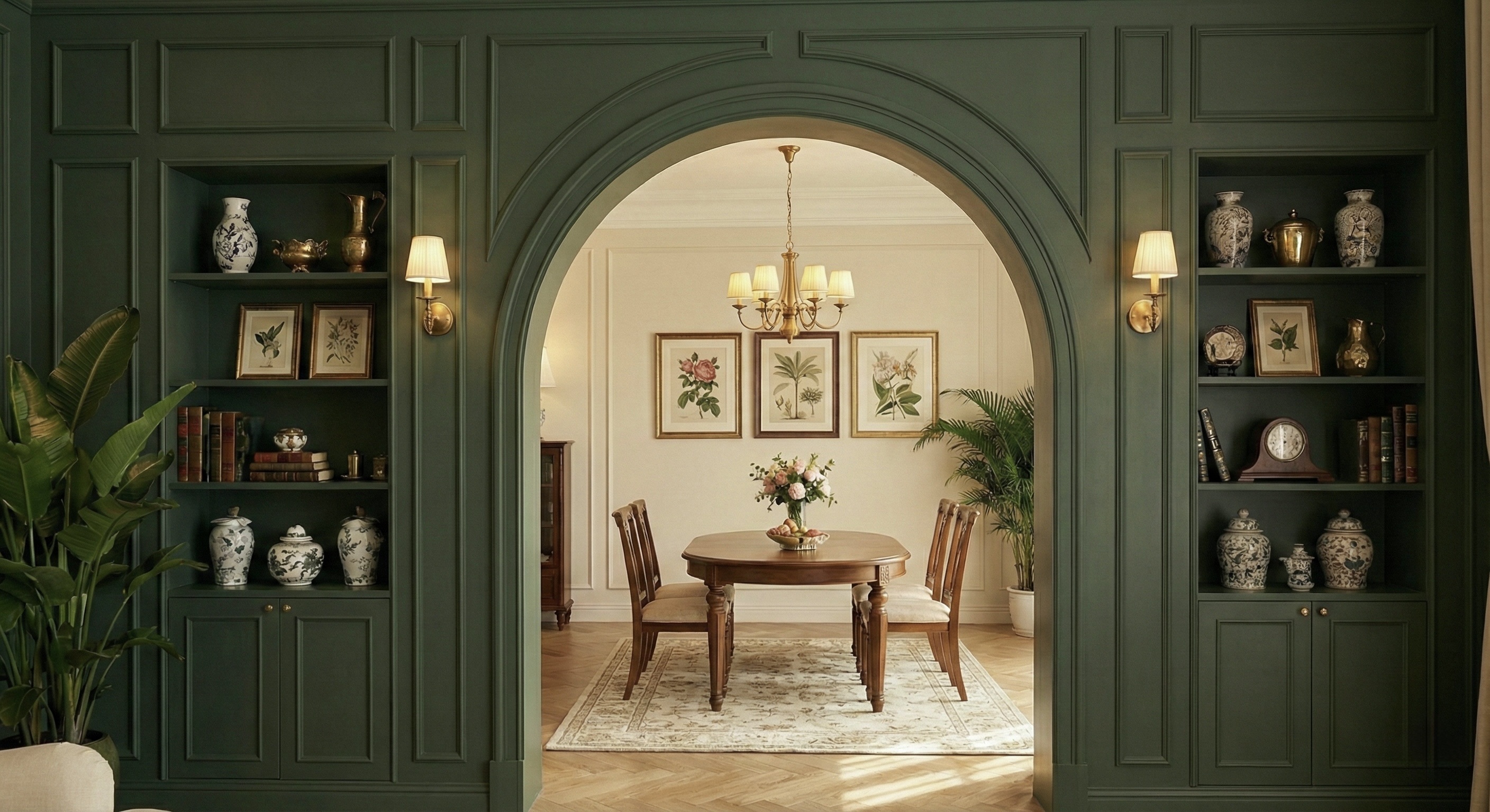 Wall sconces are positioned to enhance panel depth and highlight moulding details. Warm ambient lighting complements the green tones, preventing the space from feeling heavy or closed-in. Natural daylight is allowed to interact with surfaces, changing the mood of the room throughout the day.