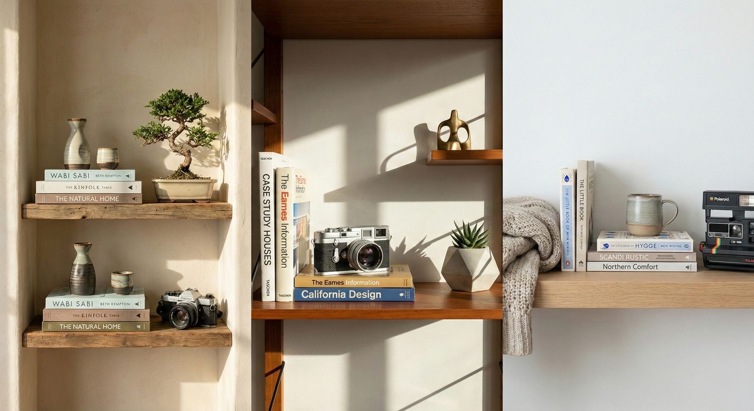 Layered shelf compositions with books, bonsai and objects show how everyday elements can form architectural balance.